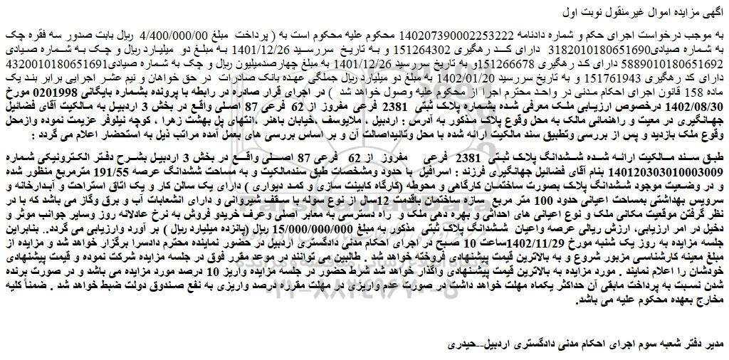 به موجب درخواست اجرای حکم و شماره دادنامه 140207390002253222 محکوم علیه محکوم است به ( پرداخت مبلغ 4/400/000/00 ریال بابت صدور سه فقره چک به شماره صیادی3182010180651690 دارای کد رهگیری 151264302 و به تاریخ سررسید 1401/12/26 به مبلغ دو میلیارد ریال و چک به شماره صیادی 5889010180651692 دارای کد رهگیری 151266678و به تاریخ سررسید 1401/12/26 به مبلغ چهارصدمیلیون ریال و چک به شماره صیادی4320010180651691 دارای کد رهگیری 151761943 و به تاریخ سررسید 1402/01/20 به مبلغ دو میلیارد ریال جملگی عهده بانک صادرات در حق خواهان و نیم عشر اجرایی برابر بند یک ماده 158 قانون اجرای احکام مدنی در واحد محترم اجرا از محکوم علیه وصول خواهد شد ) در اجرای قرار صادره در رابطه با پرونده بشماره بایگانی 0201998 مورخ 1402/08/30 درخصوص ارزیابی ملک معرفی شده بشماره پلاک ثبتی 2381 فرعی مفروز از 62 فرعی 87 اصلی واقع در بخش 3 اردبیل به مالکیت آقای فضائیل جهانگیری در معیت و راهنمائی مالک به محل وقوع پلاک مذکور به آدرس : اردبیل ، ملایوسف ،خیابان باهنر ،انتهای پل بهشت زهرا ، کوچه نیلوفر عزیمت نموده وازمحل وقوع ملک بازدید و پس از بررسی وتطبیق سند مالکیت ارائه شده با محل وتائیداصالت آن و بر اساس بررسی های بعمل آمده مراتب ذیل به استحضار اعلام می گردد :
