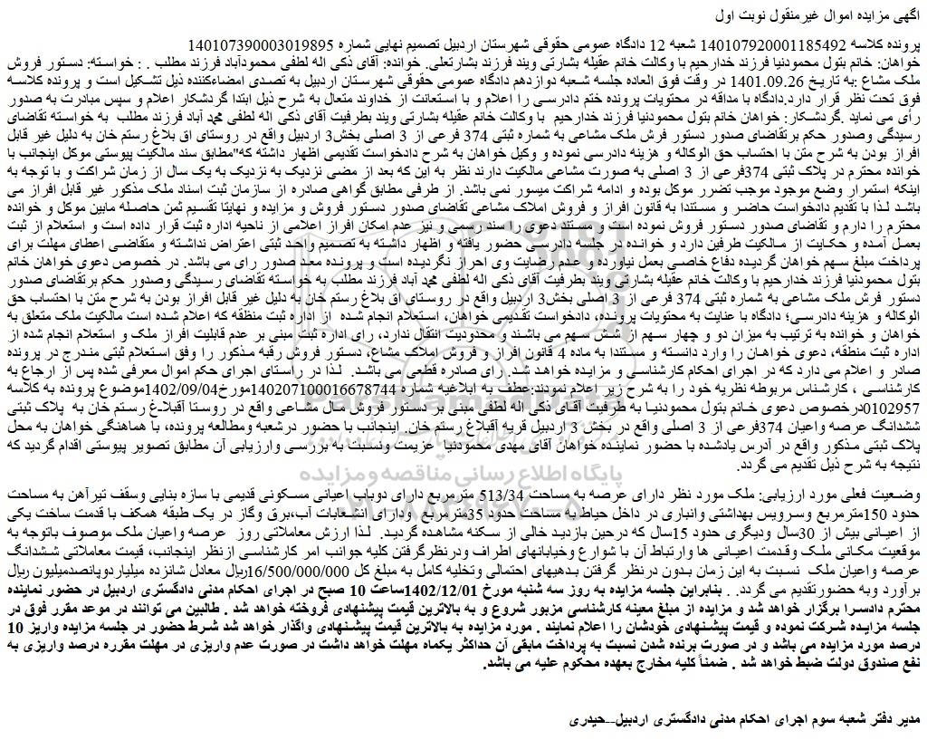 خواهان: خانم بتول محمودنیا فرزند خدارحیم با وکالت خانم عقیله بشارتی ویند فرزند بشارتعلی. خوانده: آقای ذکی اله لطفی محمودآباد فرزند مطلب . : خواسته: دستور فروش ملک مشاع :به تاریخ 1401.09.26 در وقت فوق العاده جلسه شعبه دوازدهم دادگاه عمومی حقوقی شهرستان اردبیل به تصدی امضاءکننده ذیل تشکیل است و پرونده کلاسه فوق تحت نظر قرار دارد.دادگاه با مداقه در محتویات پرونده ختم دادرسی را اعلام و با استعانت از خداوند متعال به شرح ذیل ابتدا گردشکار اعلام و سپس مبادرت به صدور رأی می نماید .گردشکار: خواهان خانم بتول محمودنیا فرزند خدارحیم  با وکالت خانم عقیله بشارتی ویند بطرفیت آقای ذکی اله لطفی محمد آباد فرزند مطلب  به خواسته تقاضای رسیدگی وصدور حکم برتقاضای صدور دستور فرش ملک مشاعی به شماره ثبتی 374 فرعی از 3 اصلی بخش3 اردبیل واقع در روستای اق بلاغ رستم خان به دلیل غیر قابل افراز بودن به شرح متن با احتساب حق الوکاله و هزینه دادرسی نموده و وکیل خواهان به شرح دادخواست تقدیمی اظهار داشته که"مطابق سند مالکیت پیوستی موکل اینجانب با خوانده محترم در پلاک ثبتی 374فرعی از 3 اصلی به صورت مشاعی مالکیت دارند نظر به این که بعد از مضى نزدیک به نزدیک به یک سال از زمان شراکت و با توجه به اینکه استمرار وضع موجود موجب تضرر موکل بوده و ادامه شراکت میسور نمی باشد. از طرفی مطابق گواهی صادره از سازمان ثبت اسناد ملک مذکور غیر قابل افراز می باشد لذا با تقدیم دادخواست حاضر و مستندا به قانون افراز و فروش املاک مشاعی تقاضای صدور دستور فروش و مزایده و نهایتا تقسیم ثمن حاصله مابین موکل و خوانده محترم را دارم و تقاضای صدور دستور فروش نموده است و مستند دعوی را سند رسمی و نیز عدم امکان افراز اعلامی از ناحیه اداره ثبت قرار داده است و استعلام از ثبت بعمل آمده و حکایت از مالکیت طرفین دارد و خوانده در جلسه دادرسی حضور یافته و اظهار داشته به تصمیم واحد ثبتی اعتراض نداشته و متقاضی اعطای مهلت برای پرداخت مبلغ سهم خواهان گردیده دفاع خاصی بعمل نیاورده و عدم رضایت وی احراز نگردیده است و پرونده معد صدور رای می باشد. در خصوص دعوی خواهان خانم بتول محمودنیا فرزند خدارحیم با وکالت خانم عقیله بشارتی ویند بطرفیت آقای ذکی اله لطفی محمد آباد فرزند مطلب به خواسته تقاضای رسیدگی وصدور حکم برتقاضای صدور دستور فرش ملک مشاعی به شماره ثبتی 374 فرعی از 3 اصلی بخش3 اردبیل واقع در روستای اق بلاغ رستم خان به دلیل غیر قابل افراز بودن به شرح متن با احتساب حق الوکاله و هزینه دادرسی؛ دادگاه با عنایت به محتویات پرونده، دادخواست تقدیمی خواهان، استعلام انجام شده  از اداره ثبت منظقه که اعلام شده است مالکیت ملک متعلق به خواهان و خوانده به ترتیب به میزان دو و چهار سهم از شش سهم می باشند و محدودیت انتقال ندارد، رای اداره ثبت مبنی بر عدم قابلیت افراز ملک و استعلام انجام شده از اداره ثبت منطقه، دعوی خواهان را وارد دانسته و مستندا به ماده 4 قانون افراز و فروش املاک مشاع، دستور فروش رقبه مذکور را وفق استعلام ثبتی مندرج در پرونده صادر و اعلام می دارد که در اجرای احکام کارشناسی و مزایده خواهد شد. رای صادره قطعی می باشد.  لذا در راستای اجرای حکم اموال معرفی شده پس از ارجاع به کارشناسی ، کارشناس مربوطه نظریه خود را به شرح زیر اعلام نمودند:عطف به ابلاغیه شماره 140207100016678744مورخ1402/09/04موضوع پرونده به کلاسه 0102957درخصوص دعوی خانم بتول محمودنیا به طرفیت آقای ذکی اله لطفی مبنی بر دستور فروش مال مشاعی واقع در روستا آقبلاغ رستم خان به  پلاک ثبتی ششدانگ عرصه واعیان 374فرعی از 3 اصلی واقع در بخش 3 اردبیل قریه آقبلاغ رستم خان. اینجانب با حضور درشعبه ومطالعه پرونده، با هماهنگی خواهان به محل پلاک ثبتی مذکور واقع در آدرس یادشده با حضور نماینده خواهان آقای مهدی محمودنیا  عزیمت ونسبت به بررسی وارزیابی آن مطابق تصویر پیوستی اقدام گردید که نتیجه به شرح ذیل تقدیم می گردد.