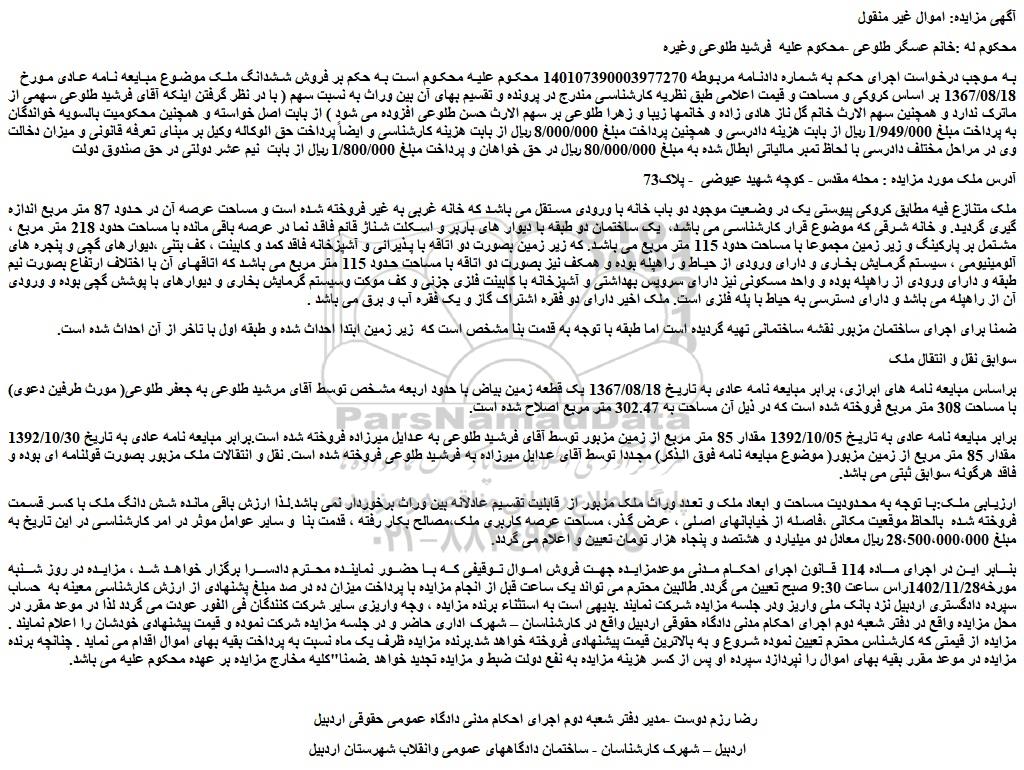 به موجب درخواست اجرای حکم به شماره دادنامه مربوطه 140107390003977270 محکوم علیه محکوم است به حکم بر فروش ششدانگ ملک موضوع مبایعه نامه عادی مورخ 1367/08/18 بر اساس کروکی و مساحت و قیمت اعلامی طبق نظریه کارشناسی مندرج در پرونده و تقسیم بهای آن بین وراث به نسبت سهم ( با در نظر گرفتن اینکه آقای فرشید طلوعی سهمی از ماترک ندارد و همچنین سهم الارث خانم گل ناز هادی زاده و خانمها زیبا و زهرا طلوعی بر سهم الارث حسن طلوعی افزوده می شود ) از بابت اصل خواسته و همچنین محکومیت بالسویه خواندگان به پرداخت مبلغ 1/949/000 ریال از بابت هزینه دادرسی و همچنین پرداخت مبلغ 8/000/000 ریال از بابت هزینه کارشناسی و ایضاً پرداخت حق الوکاله وکیل بر مبنای تعرفه قانونی و میزان دخالت وی در مراحل مختلف دادرسی با لحاظ تمبر مالیاتی ابطال شده به مبلغ 80/000/000 ریال در حق خواهان و پرداخت مبلغ 1/800/000 ریال از بابت  نیم عشر دولتی در حق صندوق دولت