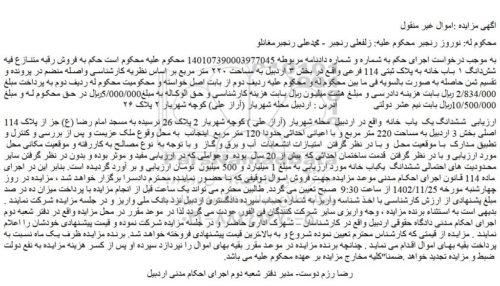 به موجب درخواست اجرای حکم به شماره و شماره دادنامه مربوطه 140107390003977045 محکوم علیه محکوم است حکم به فروش رقبه متنازع فیه شش دانگ ۱ باب خانه به پلاک ثبتی 114 فرعی واقع در بخش ۳ اردبیل به مساحت ۲۲۰ متر مربع بر اساس نظریه کارشناسی واصله منضم در پرونده و تقسیم ثمن حاصله به صورت بالسویه فی ما بین محکوم له و محکوم علیه ردیف دوم از بابت اصل خواسته و محکومیت محکوم له ردیف دوم به پرداخت مبلغ 2/834/000 ریال بابت هزینه دادرسی و مبلغ هشت میلیون ریال بابت هزینه کارشناسی و حق الوکاله به مبلغ5/000/000ریال در حق محکوم له و مبلغ 10/500/000ریال بابت نیم عشر دولتی آدرس : اردبیل محله شهریار (آراز علی) کوچه شهریار ۲ پلاک ۲۶