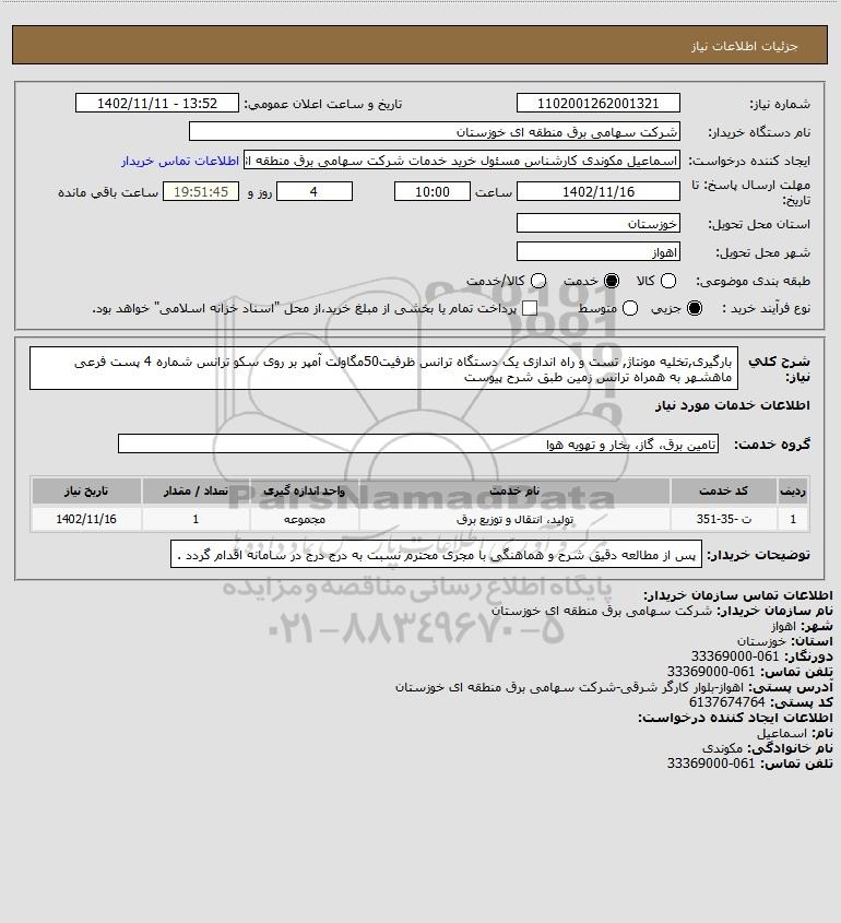 شرح کلی نیاز: بارگیری,تخلیه مونتاژ, تست و راه اندازی یک دستگاه ترانس ظرفیت50مگاولت آمپر بر روی سکو ترانس شماره 4 پست فرعی ماهشهر به همراه ترانس زمین طبق شرح پیوست
