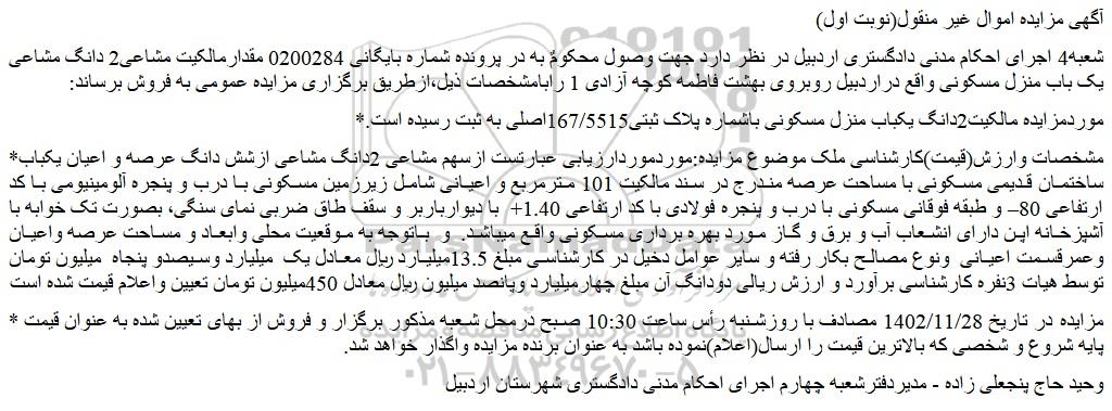 شعبه4 اجرای احکام مدنی دادگستری اردبیل در نظر دارد جهت وصول محکومٌ به در پرونده شماره بایگانی 0200284 مقدارمالکیت مشاعی2 دانگ مشاعی یک باب منزل مسکونی واقع دراردبیل روبروی بهشت فاطمه کوچه آزادی 1 رابامشخصات ذیل،ازطریق برگزاری مزایده عمومی به فروش برساند: