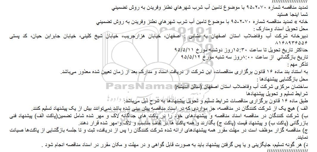تمدید مناقصه تامين آب شرب شهرهاي نطنز و فريدن از کلیه افراد متخصص و شرکتها واجد شرایط دعوت به عمل میآید در مناقصه با کد خبرگزاری پارس نماد: 700950 شرکت نمایند.
