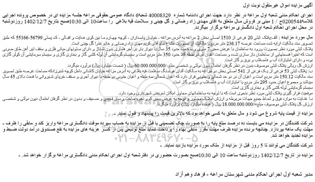 - مزایده در تاریخ 1402/12/7 روزدوشنبه ساعت 10 الی 10:30صبح بصورت حضوری در دفترشعبه اول اجرای احکام مدنی دادگستری مراغه برگزار خواهد شد.