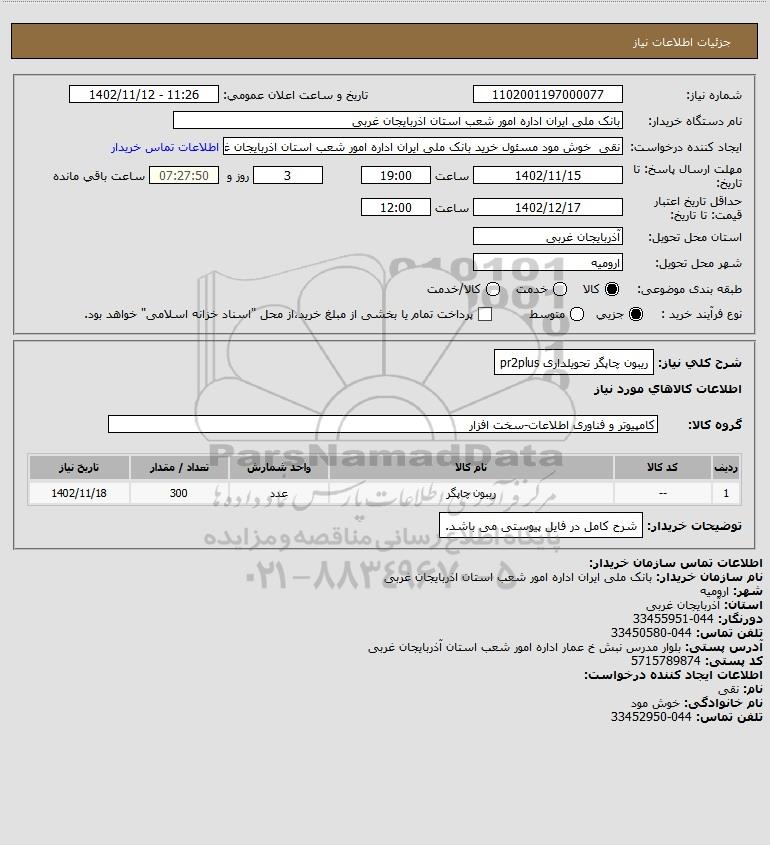 شرح کلی نیاز: ریبون چاپگر تحویلداری pr2plus