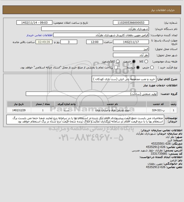 شرح کلی نیاز: خرید و نصب مجموعه پلی اتیلن (ست بازی کودکان )