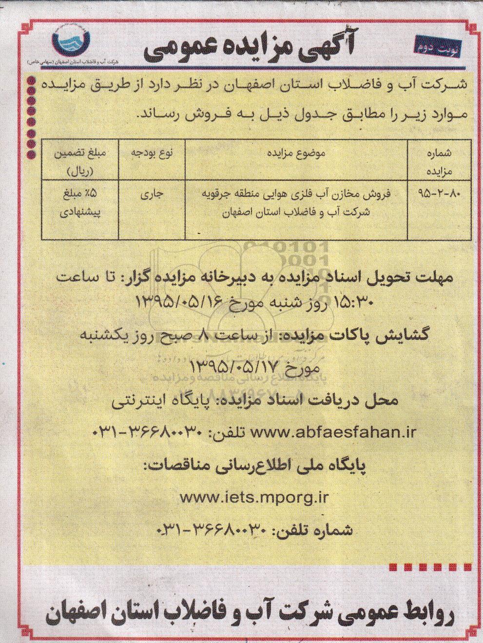 95-2-80 فروش مخازن آب فلزی هوایی منطقه جرقویه شرکت آب و فاضلاب استان اصفهان
