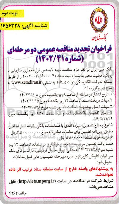 بانک ملی ایران در نظر دارد مناقصه تهیه لایسنس ابزار معماری سازمانی با رویکرد قابلیت محور به شماره ثبت ستاد 2002001056000041 را از طریق سامانه تدارکات الکترونیکی دولت (ستاد) به نشانی ستاد ایران به شرح زیر برگزار نماید