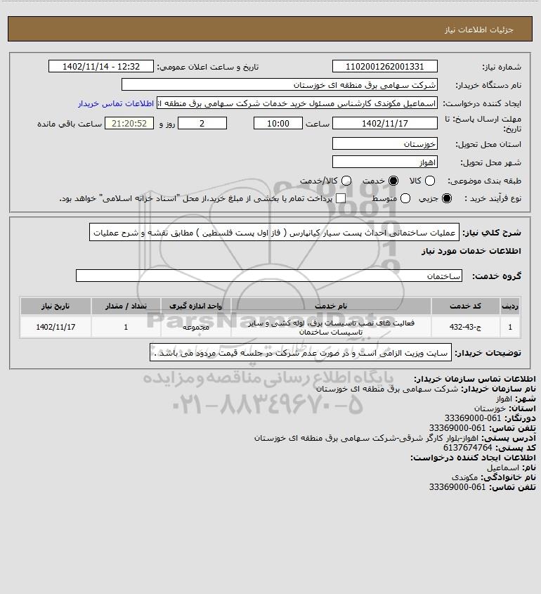 استعلام عملیات ساختمانی احداث پست سیار کیانپارس ( فاز اول پست فلسطین ) مطابق نقشه و شرح عملیات, استعلام عملیات ساختمانی احداث پست سیار کیانپارس ( فاز اول پست فلسطین ) مطابق نقشه و شرح عملیات
