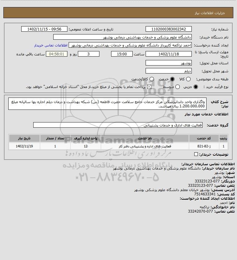 شرح کلی نیاز: واگذاری واحد داندانپزشکی مرکز خدمات جامع سلامت حضرت فاطمه (س) شبکه بهداشت و درمان دیلم اجاره بها سالیانه مبلغ 1،200،000،000 ریال میباشد.