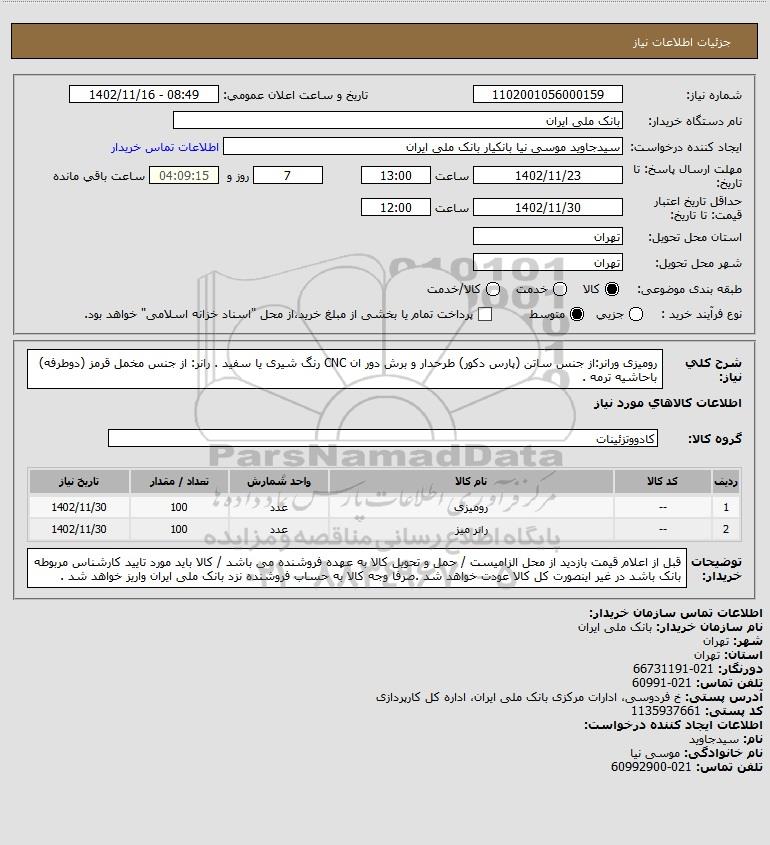 استعلام بها و موضوع استعلام استعلام رومیزی ورانر:از جنس ساتن (پارس دکور) طرحدار و برش دور ان CNC رنگ شیری یا سفید . رانر: از جنس مخمل قرمز (دوطرفه) باحاشیه ترمه . به اطلاع کلیه شرکتها و افراد متخصص واجد شرایط میرساند، آگهی گذار در نظر دارد از طریق استعلام بها، نسبت به انتخاب و دریافت پیشنهادات اقدام نماید. این استعلام با کد آگهی ثبت شده در سامانه خبرگزاری پارس نماد : 7028216 منتشر شده است. مشخصات استعلام : تاریخ شروع استعلام: 1402/11/16 آخرین مهلت ارسال پیشنهاد قیمت : 1402/11/23 و محل اجرای پروژه : استان تهران میباشد. استعلام قیمت مورد درخواست : استعلام رومیزی ورانر:از جنس ساتن (پارس دکور) طرحدار و برش دور ان CNC رنگ شیری یا سفید . رانر: از جنس مخمل قرمز (دوطرفه) باحاشیه ترمه . با دستهبندیهای تخصصی و گروه های مرتبط : نخ و پارچه, طراحی چاپ و تبلیغات, استعلام اطلاع رسانی میگردد.