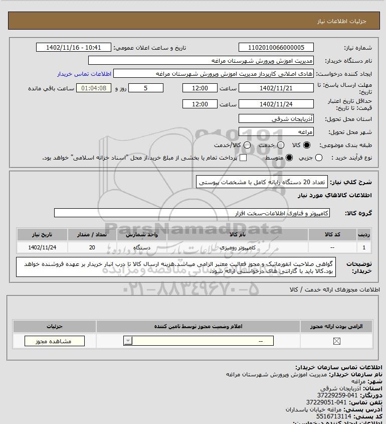 شرح کلی نیاز: تعداد 20 دستگاه رایانه کامل با مشخصات پیوستی