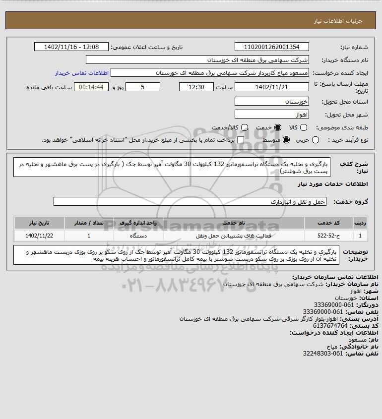 شرح کلی نیاز: بارگیری و تخلیه یک دستگاه ترانسفورماتور 132 کیلوولت 30 مگاولت آمپر توسط جک ( بارگیری در پست برق ماهشهر و تخلیه در پست برق شوشتر)