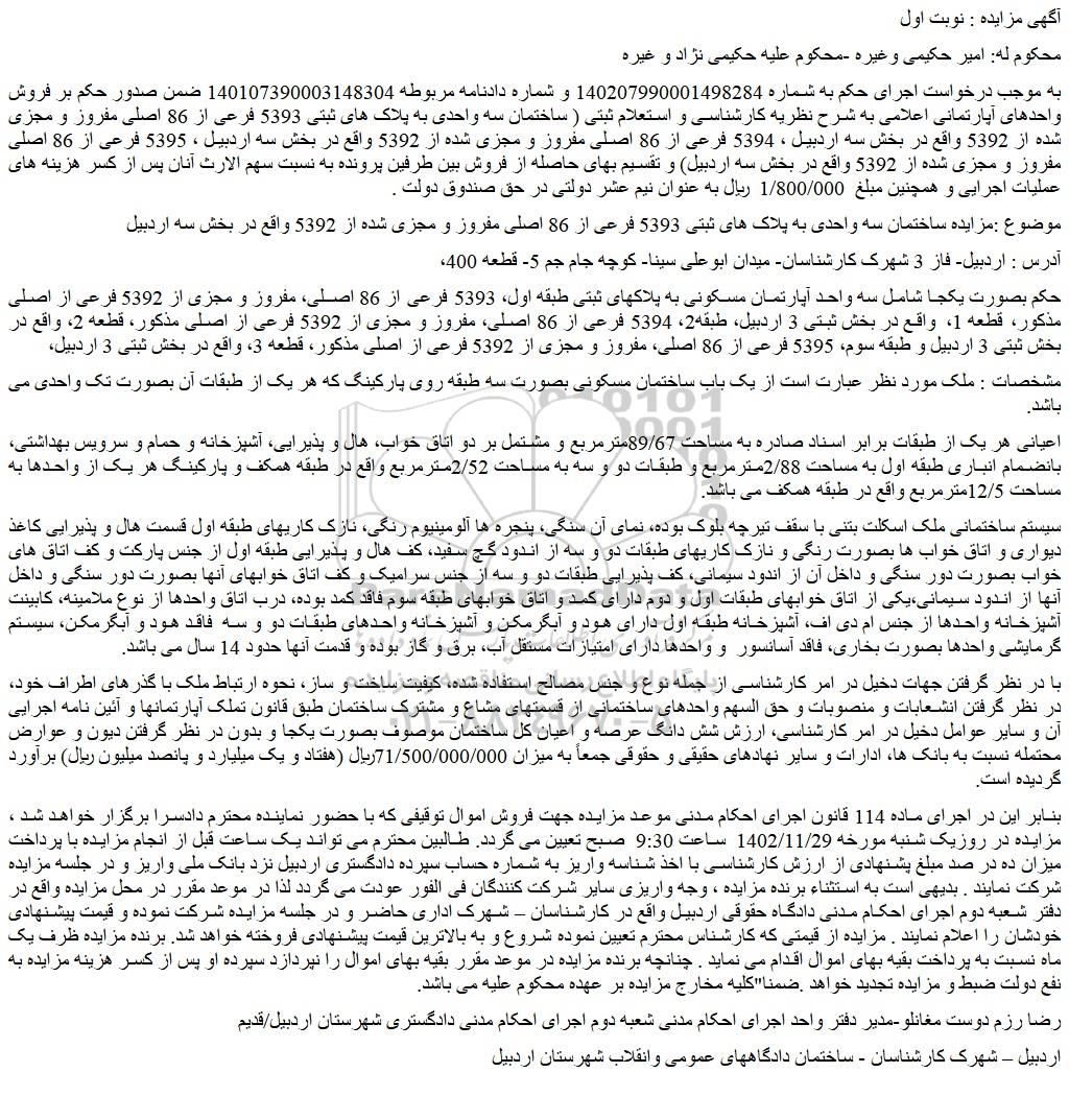 به موجب درخواست اجرای حکم به شماره 140207990001498284 و شماره دادنامه مربوطه 140107390003148304 ضمن صدور حکم بر فروش واحدهای آپارتمانی اعلامی به شرح نظریه کارشناسی و استعلام ثبتی ( ساختمان سه واحدی به پلاک های ثبتی 5393 فرعی از 86 اصلی مفروز و مجزی شده از 5392 واقع در بخش سه اردبیل ، 5394 فرعی از 86 اصلی مفروز و مجزی شده از 5392 واقع در بخش سه اردبیل ، 5395 فرعی از 86 اصلی مفروز و مجزی شده از 5392 واقع در بخش سه اردبیل) و تقسیم بهای حاصله از فروش بین طرفین پرونده به نسبت سهم الارث آنان پس از کسر هزینه های عملیات اجرایی و همچنین مبلغ 1/800/000 ریال به عنوان نیم عشر دولتی در حق صندوق دولت .