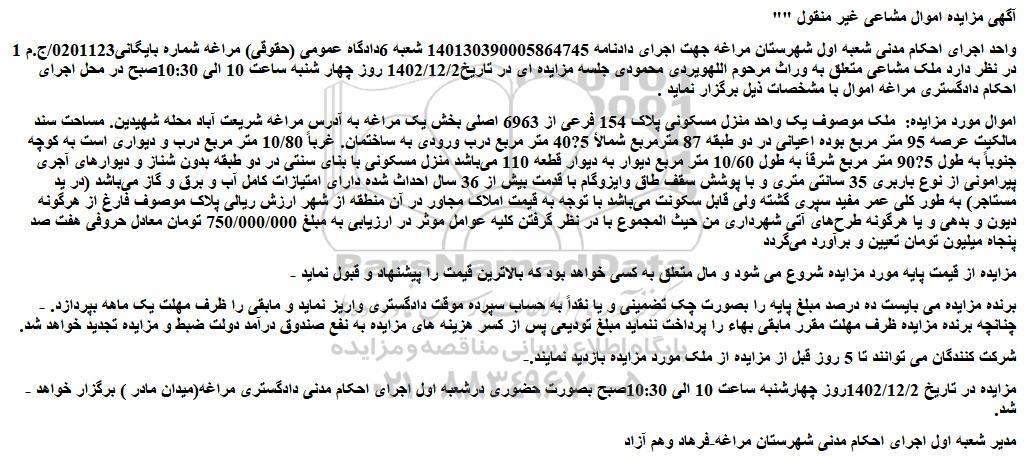 - مزایده در تاریخ 1402/12/2روز چهارشنبه ساعت 10 الی 10:30صبح بصورت حضوری درشعبه اول اجرای احکام مدنی دادگستری مراغه(میدان مادر ) برگزار خواهد شد.