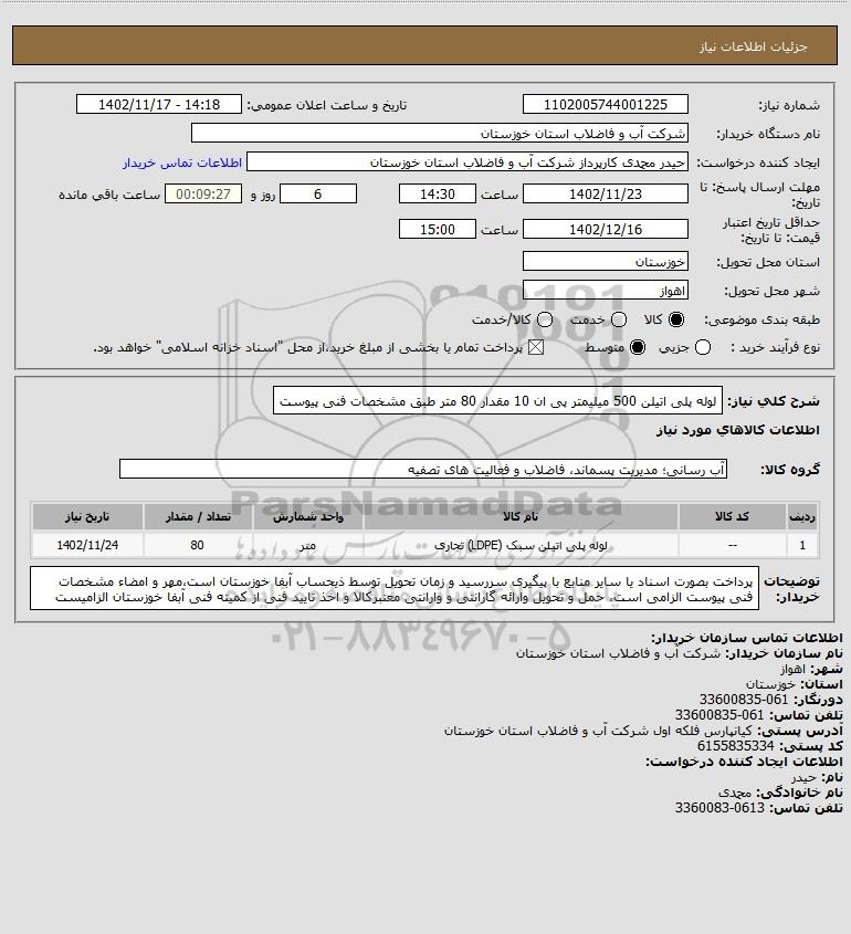 استعلام لوله پلی اتیلن 500 میلیمتر پی ان 10 مقدار 80 متر طبق مشخصات فنی پیوست, استعلام لوله پلی اتیلن 500 میلیمتر پی ان 10 مقدار 80 متر طبق مشخصات فنی پیوست