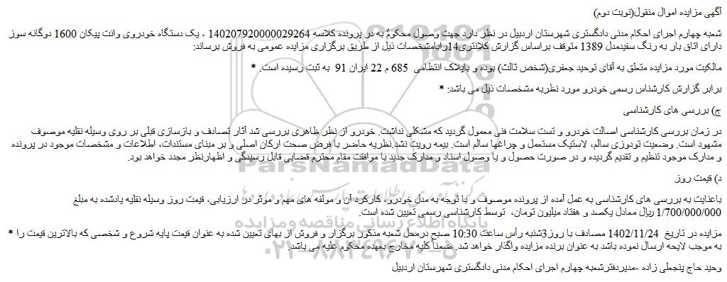 شعبه چهارم اجرای احکام مدنی دادگستری شهرستان اردبیل در نظر دارد جهت وصول محکومٌ به در پرونده کلاسه 140207920000029264 ، یک دستگاه خودروی وانت پیکان 1600 دوگانه سوز دارای اتاق بار به رنگ سفیدمدل 1389 متوقف براساس گزارش کلانتری14رابامشخصات ذیل از طریق برگزاری مزایده عمومی به فروش برساند: