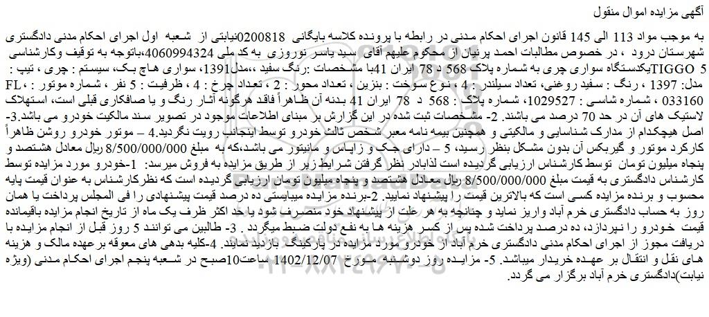 به موجب مواد 113 الی 145 قانون اجرای احکام مدنی در رابطه با پرونده کلاسه بایگانی  0200818نیابتی از  شعبه  اول اجرای احکام مدنی دادگستری شهرستان درود  ، در خصوص مطالبات احمد پرنیان از محکوم علیهم آقای  سید یاسر نوروزی  به کد ملی 4060994324،باتوجه به توقیف وکارشناسی  یکدستگاه سواری چری به شماره پلاک 568 د 78 ایران 41با مشخصات :رنگ سفید ،،مدل1391، سواری هاچ بک، سیستم : چری ، تیپ : TIGGO 5 FL، مدل: 1397 ، رنگ : سفید روغنی، تعداد سیلندر : 4 ، نوع سوخت : بنزین ، تعداد محور : 2 ، تعداد چرخ : 4 ، ظرفیت : 5 نفر ، شماره موتور : 033160 ، شماره شاسی : 1029527، شماره پلاک : 568 د  78 ایران 41 بدنه آن ظاهراً فاقد هرگونه آثار رنگ و یا صافکاری قبلی است، استهلاک لاستیک های آن در حد 70 درصد می باشند. 2- مشخصات ثبت شده در این گزارش بر مبنای اطلاعات موجود در تصویر سند مالکیت خودرو می باشد.3- اصل هیچکدام از مدارک شناسایی و مالکیتی و همچنین بیمه نامه معبر شخص ثالث خودرو توسط اینجانب رویت نگردید.4 – موتور خودرو روشن ظاهراً کارکرد موتور و گیربکس آن بدون مشکل بنظر رسید، 5 – دارای جک و زاپاس و مانیتور می باشد،که به  مبلغ 8/500/000/000 ریال معادل هشتصد و پنجاه میلیون تومان  توسط کارشناس ارزیابی گردیده است لذابادر نظر گرفتن شرایط زیر از طریق مزایده به فروش میرسد:  1-خودرو مورد مزایده توسط کارشناس دادگستری به قیمت مبلغ 8/500/000/000 ریال معادل هشتصد و پنجاه میلیون تومان ارزیابی گردیده است که نظرکارشناس به عنوان قیمت پایه محسوب و برنده مزایده کسی است که بالاترین قیمت را پیشنهاد نمایید. 2-برنده مزایده میبایستی ده درصد قیمت پیشنهادی را فی المجلس پرداخت یا همان روز به حساب دادگستری خرم آباد واریز نماید و چنانچه به هر علت از پیشنهاد خود منصرف شود یا حد اکثر ظرف یک ماه از تاریخ انجام مزایده باقیمانده قیمت  خودرو را نپردازد، ده درصد پرداخت شده پس از کسر هزینه ها به نفع دولت ضبط میگردد . 3- طالبین می توانند 5 روز قبل از انجام مزایده با دریافت مجوز از اجرای احکام مدنی دادگستری خرم آباد از خودرو مورد مزایده در پارکینگ  بازدید نمایند. 4-کلیه بدهی های معوقه برعهده مالک و هزینه های نقل و انتقال بر عهده خریدار میباشد. 5- مزایده روز دوشنبه  مورخ  1402/12/07 ساعت10صبح در شعبه پنجم اجرای احکام مدنی (ویژه نیابت)دادگستری خرم آباد برگزار می گردد.