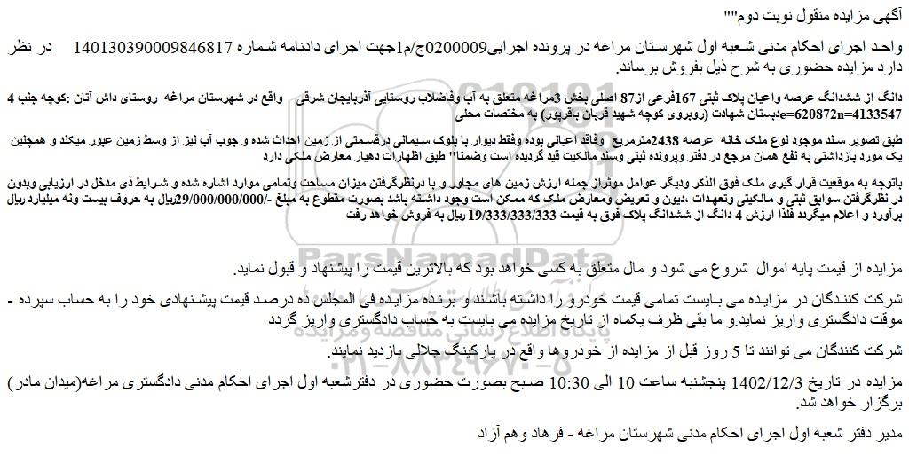 مزایده در تاریخ 1402/12/3 پنجشنبه ساعت 10 الی 10:30 صبح بصورت حضوری در دفترشعبه اول اجرای احکام مدنی دادگستری مراغه(میدان مادر) برگزار خواهد شد.