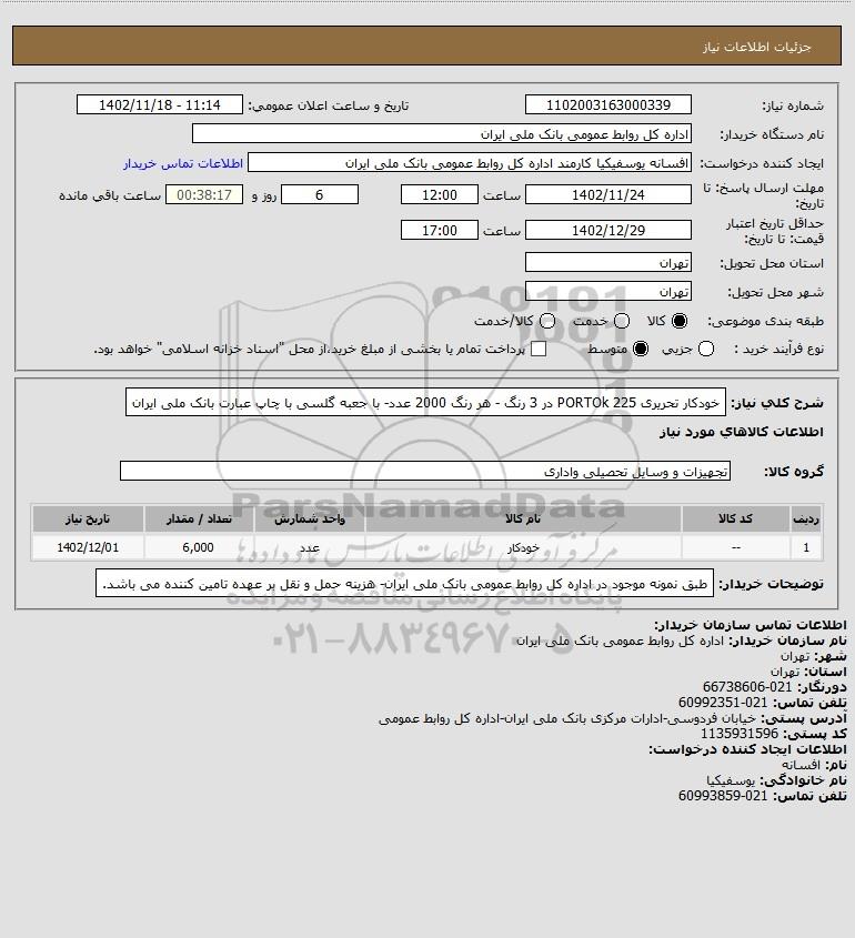 شرح کلی نیاز: خودکار تحریری PORTOk 225 در 3 رنگ - هر رنگ 2000 عدد- با جعبه گلسی با چاپ عبارت بانک ملی ایران