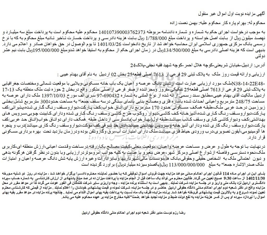 متن آگهی: آگهی مزایده نوبت اول اموال غیر منقول محکوم له: بهرام پاره کار محکوم علیه: بهمن نعمت زاده به موجب درخواست اجرای حکم به شماره و شماره دادنامه مربوطه 140107390003762373 محکوم علیه محکوم است به پرداخت مبلغ سه میلیارد و نهصد میلیون ریال از بابت اصل خواسته و پرداخت مبلغ 1/788/000 ریال بابت هزینه دادرسی و پرداخت خسارت تاخیر تادیه مبلغ محکوم به که با نرخ رسمی بانک مرکزی جمهوری اسلامی ایران محاسبه خواهد شد از تاریخ دادخواست 1401/03/26 تا یوم الوصول در حق خواهان صادر و اعلام می دارد. بدیهی است که هزینه اصلی دادرسی به مبلغ 134/500/000ریال در زمان اجرای حکم از محکوم به استیفا خواهد شدومبلغ 195/000/000ریال بابت نیم عشر دولتی آدرس: اردبیل-خیابان شریعتی-کوچه هلال احمر-کوچه شهید فقیه نجفی-پلاک24 ارزیابی وارائه قیمت روز ملک به پلاک ثبتی 29 فرعی از 7613 اصلی قطعه25 بخش 02 اردبیل به نام آقای بهنام غیبی : ملک مورد ارزیابی عبارت است ازشش دانگ عرصه و اعیان یک باب خانه مسکونی-ویلایی با موقعیت شمالی ومختصات جغرافیاییN38-14-22E48-17-13 به پلاک ثبتی 29 فرعی از7613 اصلی قطعه25 تفکیکی مفروز ومجزاشده ازصفر فرعی ازاصلی مذکور واقع دربخش 2 حوزه ثبت ملک منطقه یک اردبیل مالکیت آقای بهنام غیبی،مطابق سند رسمی ارائه شده از نوع المثنی به شماره 690432-97 سری الف مورخ 1397/10/03 ملک دارای عرصه به مساحت 248/75 مترمربع واعیانی احداث شده باسازه فلزی ومصالح بنایی بانمای سنگی درسه سقف جمعا" به مساحت حدود300 مترمربع شامل:بخشی زیرزمین درحد غربی ملک،طبقه همکف مسکونی حدود 170 مترمربع دارای اتاق خواب:کف پارکت،دیواروسقف رنگ گاری شده،پذیرائی:کف پارکت،دیواروسقف رنگ کاری شده،آشپزخانه کف کاشی،دیوار روکوب طرح کاشی وسقف رنگ کاری شده ودارای کابینت چوبی،سرویس های بهداشتی:کف ودیوارکاشی کاری وسقف کاذب میباشد،طبقه اول(بهارخواب)بادسترسی ازداخل طبقه همکف دارای دواتاق خواب(اتاق حد غربی:کف پارکت،دیواروسقف رنگ کاری شده ودارای آشپزخانه وسرویس بهداشتی میباشد،اتاق حد شرقی کف موکت،دیواروسقف رنگ کاری میباشد)درب و پنجره ها آلومینیومی،آیفون تصویری،درب ورودی حیاط فلزی میباشد،ملک دارای امتیازات آب،برق وگازوتلفن بوده ودرزمان بازدید تحت بهره برداری مسکونی قرار دارد. درنهایت با توجه به طول و عرض و مساحت عرصه واعیان، موقعیت محلی،کیفیت مصالح بکاررفته درساخت وقدمت اعیانی،ارزش منطقه ای،کاربری ملک،نحوه دسترسی وفاصله ازشوارع اصلی ومرکز شهر،عرض معبرو با عنایت به کلیه جوانب امروموثردرارزیابی وبا بدون درنظر گرفتن هرگونه بدهی و دیون احتمالی ملک به اشخاص حقیقی وحقوقی،بانک ها،موسسات مالی،شهرداریها وسایرادارات وغیره ارزش پایه شش دانگ عرصه واعیان و امتیازات ملک صدرالاشاره جمعا" به مبلغ 113/000/000/000 ریال(یکصدوسیزده میلیاردریال) براورد گردیده است بنابر این در اجرای ماده 114 قانون اجرای احکام مدنی موعد مزایده جهت فروش اموال توقیفی که با حضور نماینده محترم دادسرا برگزار خواهد شد ، مزایده در روز دو شنبه مورخه 1402/11/30 از ساعت 9:30 صبح تعیین می گردد. طالبین محترم می تواند یک ساعت قبل از انجام مزایده با پرداخت میزان ده در صد مبلغ پشنهادی از ارزش کارشناسی به شماره حساب سپرده دادگستری اردبیل نزد بانک ملی واریز و در جلسه مزایده شرکت نمایند . بدیهی است به استثناء برنده مزایده ، وجه واریزی سایر شرکت کنندگان فی الفور عودت می گردد لذا در موعد مقرر در محل مزایده واقع در دفتر شعبه دوم اجرای احکام مدنی دادگاه حقوقی اردبیل حاضر و در جلسه مزایده شرکت نموده و قیمت پیشنهادی خودشان را اعلام نمایند . مزایده از قیمتی که کارشناس محترم تعیین نموده شروع و به بالاترین قیمت پیشنهادی فروخته خواهد شد. برنده مزایده ظرف یک ماه نسبت به پرداخت بقیه بهای اموال اقدام می نماید . چنانچه برنده مزایده در موعد مقرر بقیه بهای اموال را نپردازد سپرده او پس از کسر هزینه مزایده به نفع دولت ضبط و مزایده تجدید خواهد .ضمنا"کلیه مخارج مزایده بر عهده م