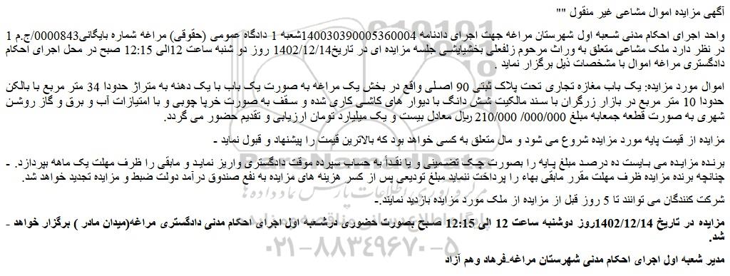 - مزایده در تاریخ 1402/12/14روز دوشنبه ساعت 12 الی 12:15 صبح بصورت حضوری درشعبه اول اجرای احکام مدنی دادگستری مراغه(میدان مادر ) برگزار خواهد شد.