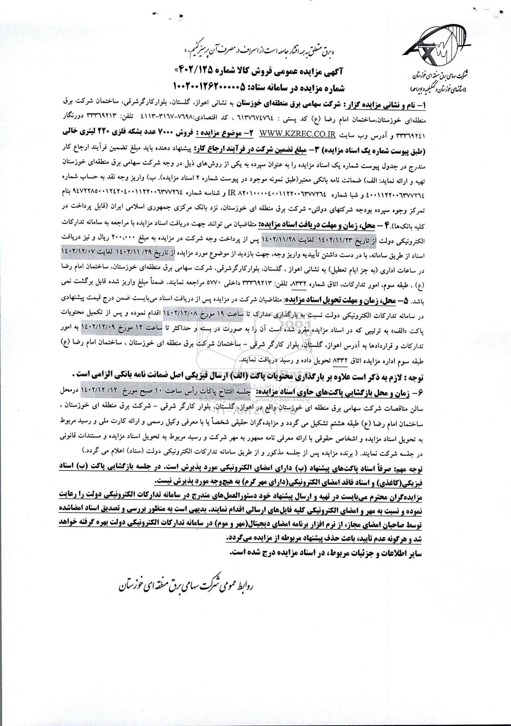 1- نام و نشانی مزایده گزار: شرکت سهامی برق منطقه ای خوزستان به نشانی اهواز گلستان بلوار کارگر شرقی، ساختمان شرکت برق منطقه ای خوزستان ساختمان امام رضا (ع) کد پستی : 6137674764 ، کد اقتصادی : 7998-3167-1113 تلفن: 33369213 دورنگار 33369241 و آدرس وب سایت WWW.KZREC.CO.IR