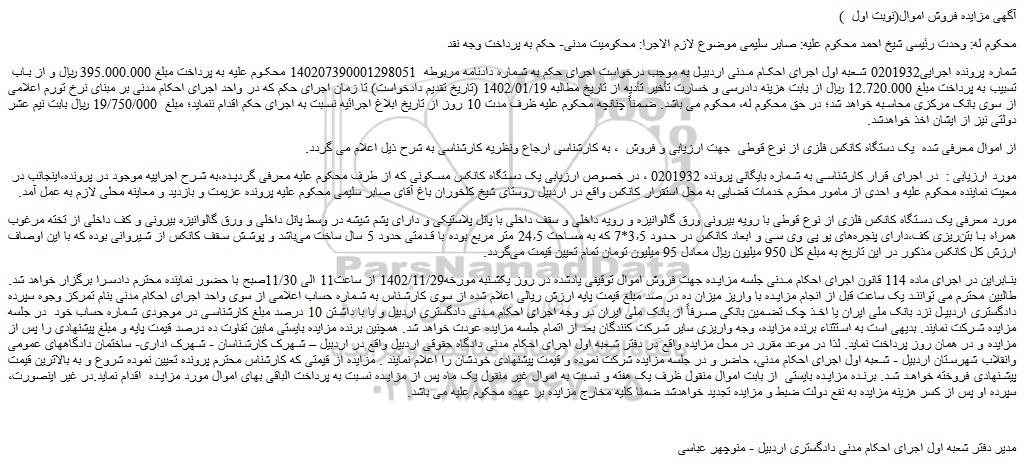 بنابراین در اجرای ماده 114 قانون اجرای احکام مدنی جلسه مزایده جهت فروش اموال توقیفی یادشده در روز یکشنبه مورخه1402/11/29 از ساعت11 الی 11/30صبح با حضور نماینده محترم دادسرا برگزار خواهد شد. طالبین محترم می توانند یک ساعت قبل از انجام مزایده با واریز میزان ده در صد مبلغ قیمت پایه ارزش ریالی اعلام شده از سوی کارشناس به شماره حساب اعلامی از سوی واحد اجرای احکام مدنی بنام تمرکز وجوه سپرده دادگستری اردبیل نزد بانک ملی ایران یا اخذ چک تضمین بانکی صرفاً از بانک ملی ایران در وجه اجرای احکام مدنی دادگستری اردبیل و یا با داشتن 10 درصد مبلغ کارشناسی در موجودی شماره حساب خود در جلسه مزایده شرکت نمایند. بدیهی است به استثناء برنده مزایده، وجه واریزی سایر شرکت کنندگان بعد از اتمام جلسه مزایده عودت خواهد شد. همچنین برنده مزایده بایستی مابین تفاوت ده درصد قیمت پایه و مبلغ پیشنهادی را پس از مزایده و در همان روز پرداخت نماید. لذا در موعد مقرر در محل مزایده واقع در دفتر شعبه اول اجرای احکام مدنی دادگاه حقوقی اردبیل واقع در اردبیل – شهرک کارشناسان - شهرک اداری- ساختمان دادگاههای عمومی وانقلاب شهرستان اردبیل - شعبه اول اجرای احکام مدنی، حاضر و در جلسه مزایده شرکت نموده و قیمت پیشنهادی خودشان را اعلام نمایند . مزایده از قیمتی که کارشناس محترم پرونده تعیین نموده شروع و به بالاترین قیمت پیشنهادی فروخته خواهد شد. برنده مزایده بایستی از بابت اموال منقول ظرف یک هفته و نسبت به اموال غیر منقول یک ماه پس از مزایده نسبت به پرداخت الباقی بهای اموال مورد مزایده اقدام نماید.در غیر اینصورت، سپرده او پس از کسر هزینه مزایده به نفع دولت ضبط و مزایده تجدید خواهدشد ضمنا کلیه مخارج مزایده بر عهده محکوم علیه می باشد.
