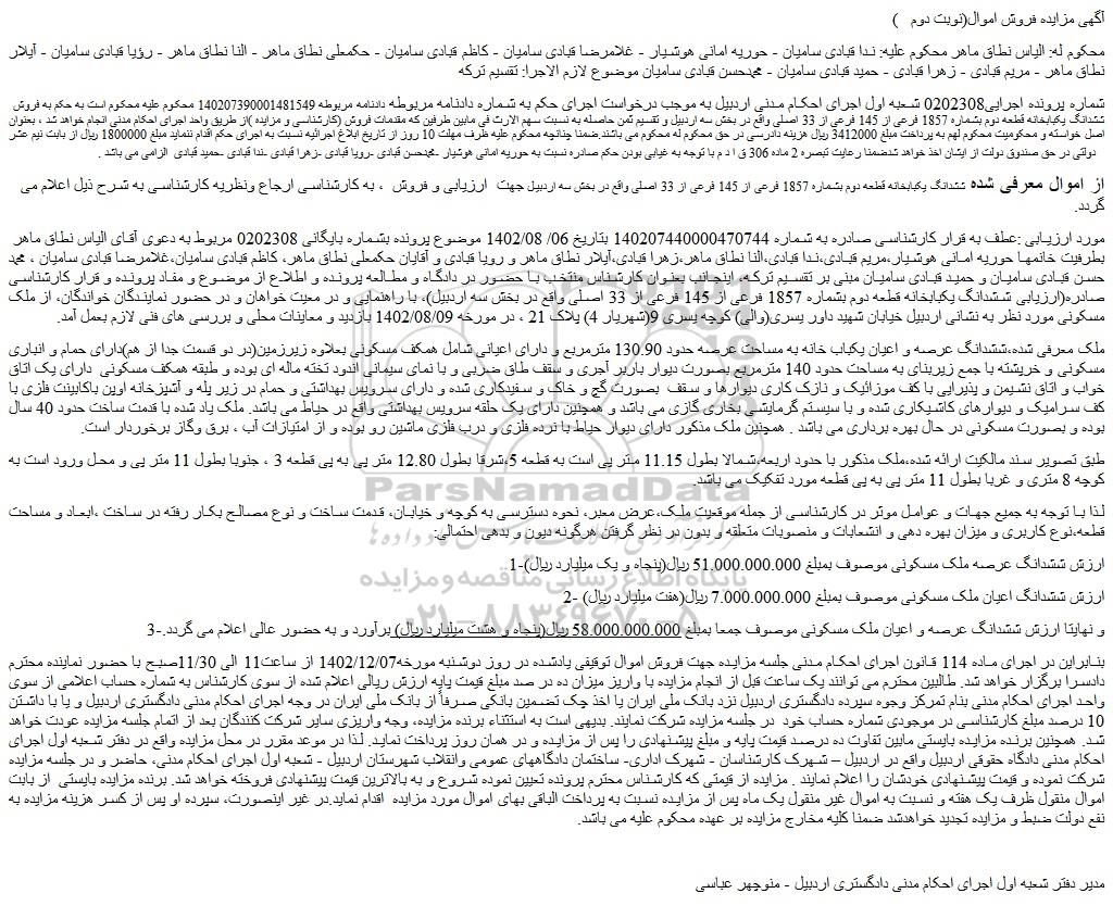 شماره پرونده اجرایی0202308 شعبه اول اجرای احکام مدنی اردبیل به موجب درخواست اجرای حکم به شماره دادنامه مربوطه دادنامه مربوطه 140207390001481549 محکوم علیه محکوم است به حکم به فروش ششدانگ یکبابخانه قطعه دوم بشماره 1857 فرعی از 145 فرعی از 33 اصلی واقع در بخش سه اردبیل و تقسیم ثمن حاصله به نسبت سهم الارث فی مابین طرفین که مقدمات فروش (کارشناسی و مزایده )از طریق واحد اجرای احکام مدنی انجام خواهد شد ، بعنوان اصل خواسته و محکومیت محکوم لهم به پرداخت مبلغ 3412000 ریال هزینه دادرسی در حق محکوم له محکوم می باشند.ضمنا چنانچه محکوم علیه ظرف مهلت 10 روز از تاریخ ابلاغ اجرائیه نسبت به اجرای حکم اقدام ننماید مبلغ 1800000 ریال از بابت نیم عشر دولتی در حق صندوق دولت از ایشان اخذ خواهد شدضمنا رعایت تبصره 2 ماده 306 ق ا د م با توجه به غیابی بودن حکم صادره نسبت به حوریه امانی هوشیار -محمدحسن قبادی -رویا قبادی -زهرا قبادی -ندا قبادی -حمید قبادی الزامی می باشد .