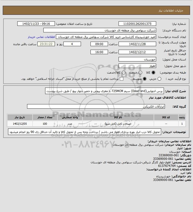 استعلام پرس انتهایی(Dead and) سیم 725MCM با مغزی پیچی و جمپر چهار پیچ / طبق شرح پیوست, استعلام پرس انتهایی(Dead and) سیم 725MCM با مغزی پیچی و جمپر چهار پیچ / طبق شرح پیوست