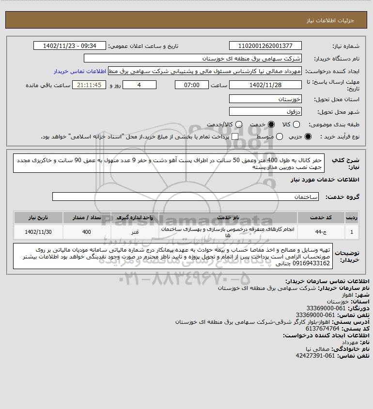 شرح کلی نیاز: حفر کانال به طول 400 متر وعمق 50 سانت در اطراف پست آهو دشت و حفر 9 عدد منهول به عمق 90 سانت و خاکریزی مجدد جهت نصب دوربین مدار بسته