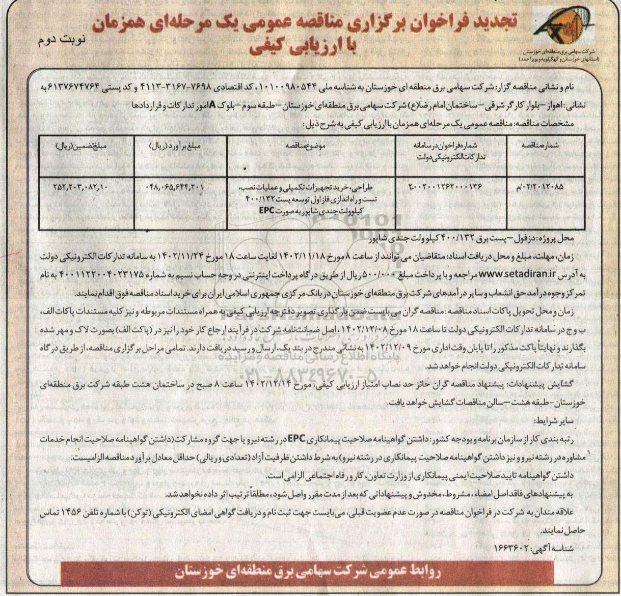 مناقصه طراحی ، خرید تجهیزات تکمیلی و عملیات نصب ، تست و راه اندازی فاز اول توسعه پست ... تجدید نوبت دوم , مناقصه طراحی ، خرید تجهیزات تکمیلی و عملیات نصب ، تست و راه اندازی فاز اول توسعه پست ... تجدید نوبت دوم
