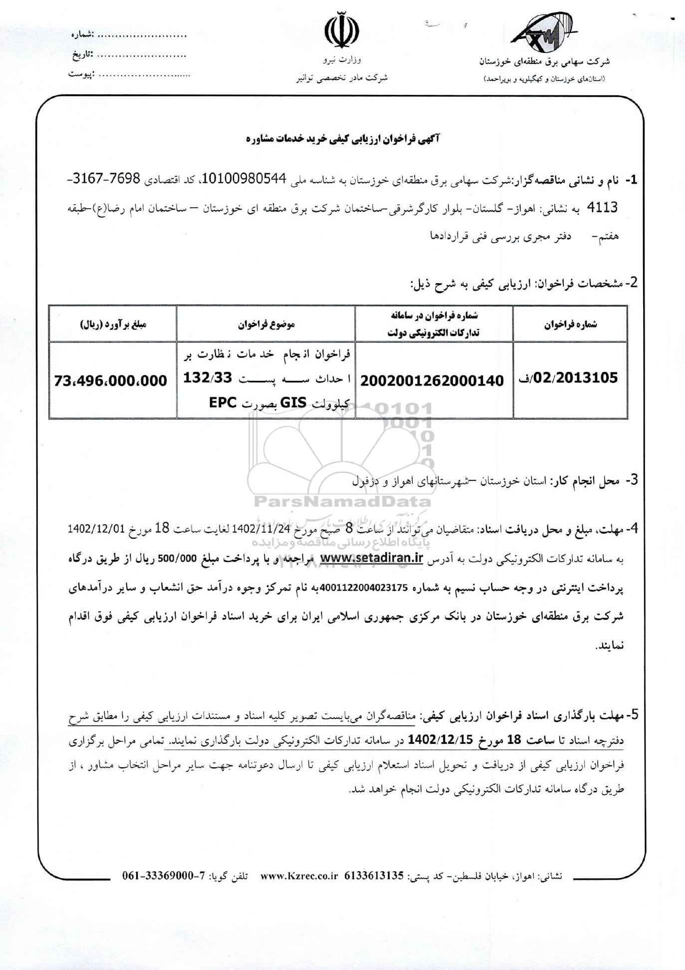 | 02/2013105 / ف | 2002001262000140 | فراخوان انجام خدمات نظارت بر احداث سه پست 132/33 کیلوولت GIS به صورت EPC | 73.496.000.000 |