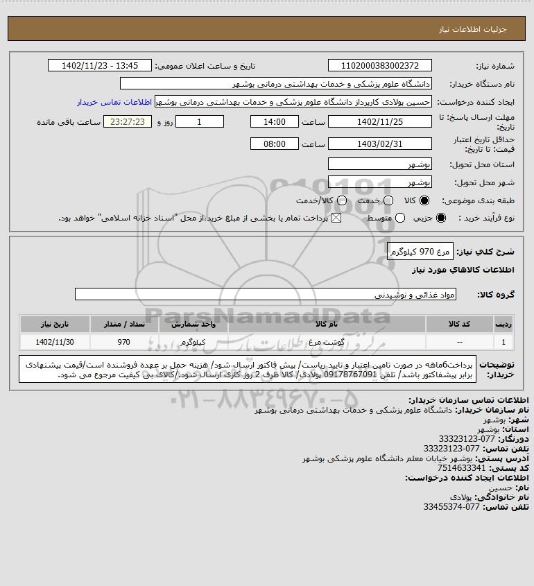 شرح کلی نیاز: مرغ 970 کیلوگرم