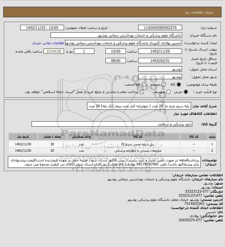 شرح کلی نیاز: پایه سرم چرخ دار 20 عدد | چهارپایه کنار تخت بیمار (تک پله) 20 عدد