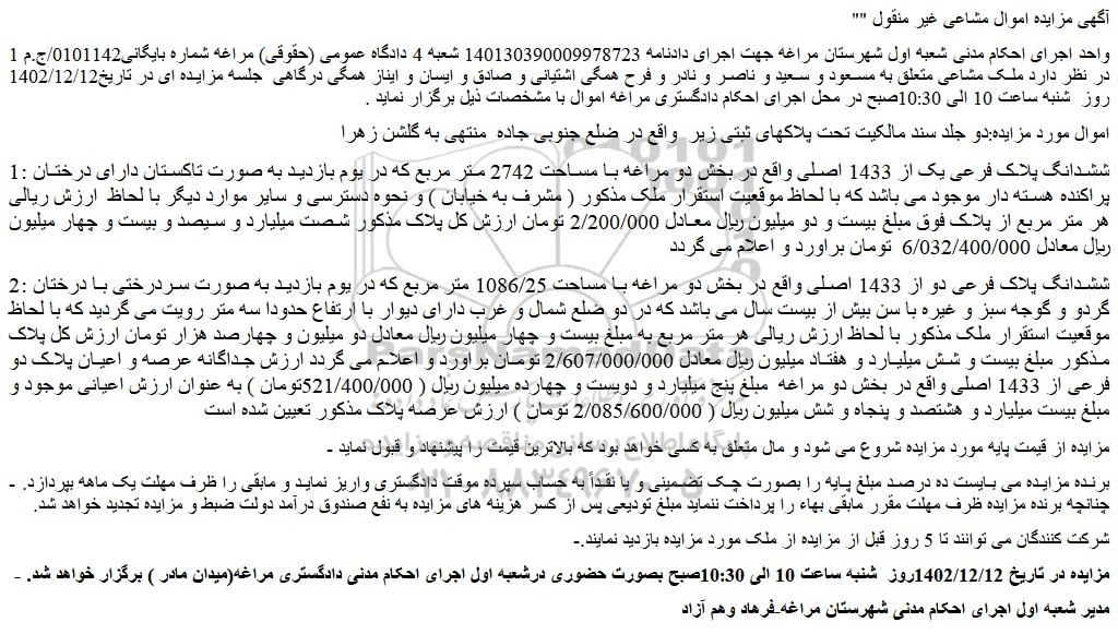 مزایده فروش ششدانگ پلاک فرعی یک از 1433 اصلی, مزایده فروش ششدانگ پلاک فرعی یک از 1433 اصلی
