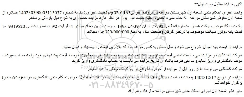 مزایده در تاریخ 1402/12/17 پنجشنبه ساعت 10 الی 10:30 صبح بصورت حضوری در دفترشعبه اول اجرای احکام مدنی دادگستری مراغه(میدان مادر) برگزار خواهد شد.