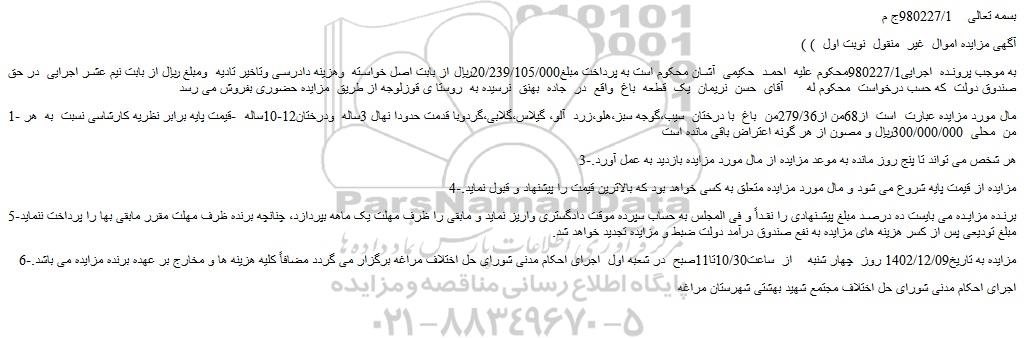 به موجب پرونده  اجرایی980227/1محکوم علیه  احمد  حکیمی  آشان محکوم است به پرداخت مبلغ20/239/105/000ریال از بابت اصل خواسته  وهزینه دادرسی وتاخیر تادیه  ومبلغ ریال از بابت نیم عشر اجرایی  در حق صندوق دولت  که حسب درخواست  محکوم له      آقای  حسن  نریمان  یک  قطعه  باغ  واقع  در  جاده  بهنق  نرسیده به  روستا ی قوزلوجه از طریق  مزایده حضوری بفروش می رسد