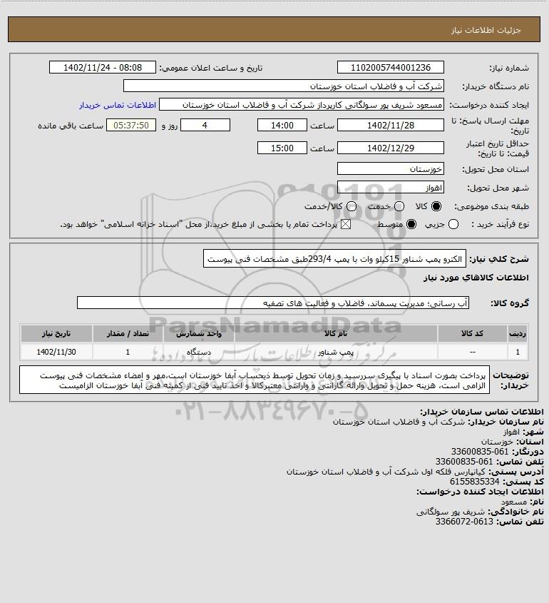 شرح کلی نیاز: الکترو پمپ شناور 15کیلو وات با پمپ 293/4طبق مشخصات فنی پیوست