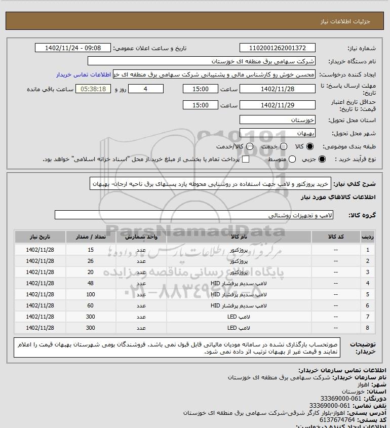 شرح کلی نیاز: خرید پروزکتور و لامپ جهت استفاده در روشنایی محوطه یارد پستهای برق ناحیه ارجان- بهبهان
