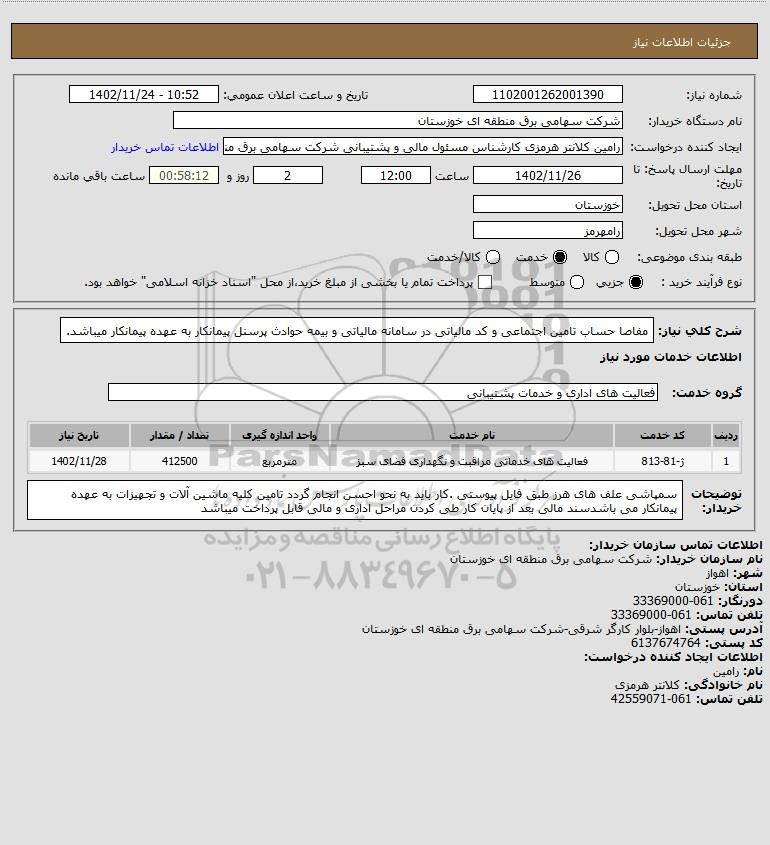 شرح کلی نیاز: مفاصا حساب تامین اجتماعی و کد مالیاتی در سامانه مالیاتی و بیمه حوادث پرسنل پیمانکار به عهده پیمانکار میباشد.