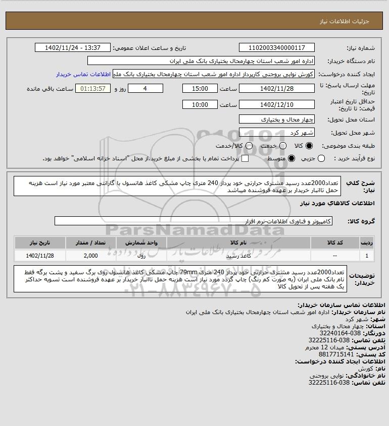 نام دستگاه خریدار:اداره امور شعب استان چهارمحال بختیاری بانک ملی ایران