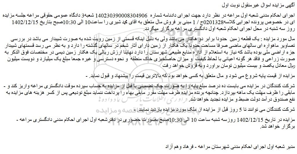 اجرای احکام مدنی شعبه اول مراغه در نظر دارد جهت اجرای دادنامه شماره 140230390008304906 شعبه3 دادگاه عمومی حقوقی مراغه جلسه مزایده ای در خصوص پرونده اجرایی کلاسه0201328ج / 1 مبنی بر فروش مال متعلق به اقای محمد شیری را ساعت10 الی 10:30صبح بتاریخ 1402/12/15 روز سه شنبه در محل اجرای احکام شعبه اول دادگستری مراغه برگزار میگردد.