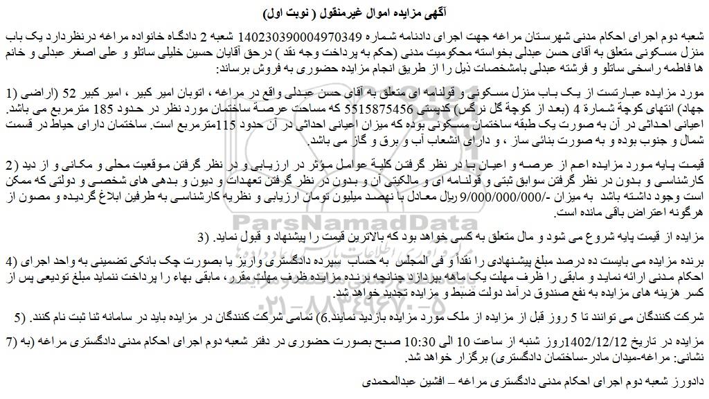 شعبه دوم اجرای احکام مدنی شهرستان مراغه جهت اجرای دادنامه شماره 140230390004970349 شعبه 2 دادگاه خانواده مراغه درنظردارد یک باب منزل مسکونی متعلق به آقای حسن عبدلی بخواسته محکومیت مدنی (حکم به پرداخت وجه نقد ) درحق آقایان حسین خلیلی ساتلو و علی اصغر عبدلی و خانم ها فاطمه راسخی ساتلو و فرشته عبدلی بامشخصات ذیل را از طریق انجام مزایده حضوری به فروش برساند: