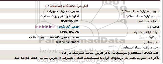 استعلام بها و موضوع استعلام استعلام , استعلام تعمیر گیربکس به اطلاع کلیه شرکتها و افراد متخصص واجد شرایط میرساند، آگهی گذار در نظر دارد از طریق استعلام بها، نسبت به انتخاب و دریافت پیشنهادات اقدام نماید. این استعلام با کد آگهی ثبت شده در سامانه خبرگزاری پارس نماد : 706678 منتشر شده است. مشخصات استعلام : تاریخ شروع استعلام: 1395/05/18 آخرین مهلت ارسال پیشنهاد قیمت : 1395/05/26 و محل اجرای پروژه : استان اصفهان میباشد. استعلام قیمت مورد درخواست : استعلام , استعلام تعمیر گیربکس با دستهبندیهای تخصصی و گروه های مرتبط : خدمات صنعتی, ساخت،نصب و تعمیرات صنایع فولاد, تجهیزات و ماشین آلات صنعتی, استعلام اطلاع رسانی میگردد.