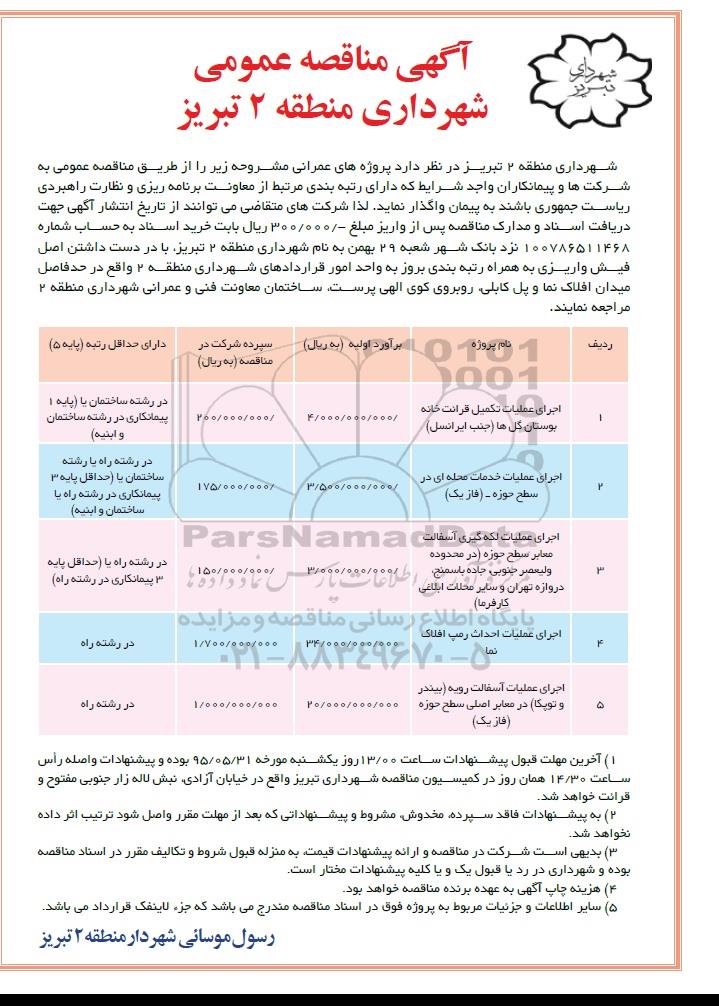 شهرداری منطقه 2 تبریز در نظر دارد پروژه های عمرانی مشروحه زیر را از طریق مناقصه عمومی به شرکت ها و پیمانکاران واجد شرایط که دارای رتبه بندی مرتبط از معاونت برنامه ریزی و نظارت راهبردی ریاست جمهوری باشند به پیمان واگذار نماید. لذا شرکت های متقاضی می توانند از تاریخ انتشار آگهی جهت دریافت اسناد و مدارک مناقصه پس از واریز مبلغ 300.000 ریال بابت خرید اسناد به حساب شماره 100786511468 نزد بانک شهر شعبه 29 بهمن به نام شهرداری منطقه 2 تبریز ، با در دست داشتن اصل فیش واریزی به همراه رتبه بندی بروز به واحد امور قراردادهای شهرداری منطقه 2 واقع در حد فاصل میدان افلاک نما و پل کابلی ، روبروی کوی الهی پرست ، ساختمان معاونت فنی و عمرانی شهرداری منطقه 2 مراجعه نمایند.