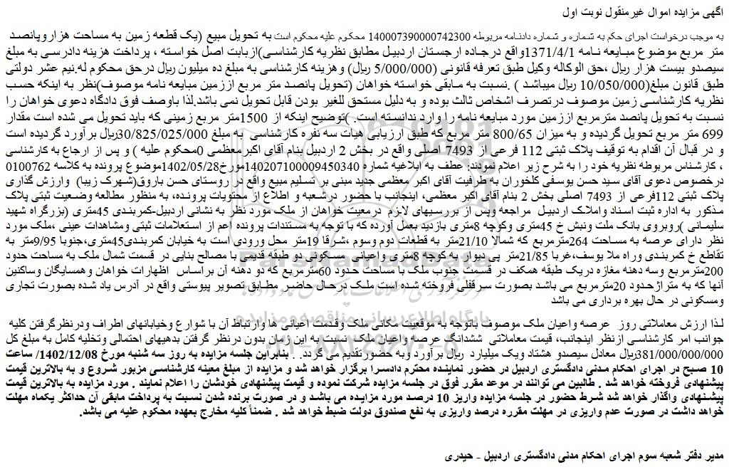 لذا ارزش معاملاتی روز عرصه واعیان ملک موصوف باتوجه به موقعیت مکانی ملک وقدمت اعیانی ها وارتباط آن با شوارع وخیابانهای اطراف ودرنظرگرفتن کلیه جوانب امر کارشناسی ازنظر اینجانب، قیمت معاملاتی ششدانگ عرصه واعیان ملک نسبت به این زمان بدون درنظر گرفتن بدهیهای احتمالی وتخلیه کامل به مبلغ کل 381/000/000/000ریال معادل سیصدو هشتاد ویک میلیارد ریال برآورد وبه حضورتقدیم می گردد. . بنابراین جلسه مزایده به روز سه شنبه مورخ 1402/12/08/ ساعت 10 صبح در اجرای احکام مدنی دادگستری اردبیل در حضور نماینده محترم دادسرا برگزار خواهد شد و مزایده از مبلغ معینه کارشناسی مزبور شروع و به بالاترین قیمت پیشنهادی فروخته خواهد شد . طالبین می توانند در موعد مقرر فوق در جلسه مزایده شرکت نموده و قیمت پیشنهادی خودشان را اعلام نمایند . مورد مزایده به بالاترین قیمت پیشنهادی واگذار خواهد شد شرط حضور در جلسه مزایده واریز 10 درصد مورد مزایده می باشد و در صورت برنده شدن نسبت به پرداخت مابقی آن حداکثر یکماه مهلت خواهد داشت در صورت عدم واریزی در مهلت مقرره درصد واریزی به نفع صندوق دولت ضبط خواهد شد . ضمناً کلیه مخارج بعهده محکوم علیه می باشد.