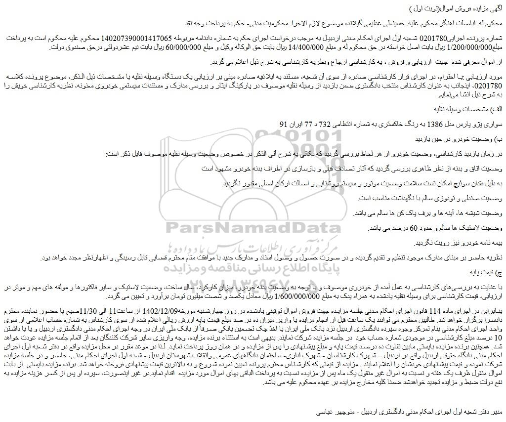 شماره پرونده اجرایی0201780 شعبه اول اجرای احکام مدنی اردبیل به موجب درخواست اجرای حکم به شماره دادنامه مربوطه 140207390001417065 محکوم علیه محکوم است به پرداخت مبلغ1/200/000/000 ریال بابت اصل خواسته در حق محکوم له و مبلغ 14/400/000 ریال بابت حق الوکاله وکیل و مبلغ 60/000/000 ریال بابت نیم عشردولتی درحق صندوق دولت.