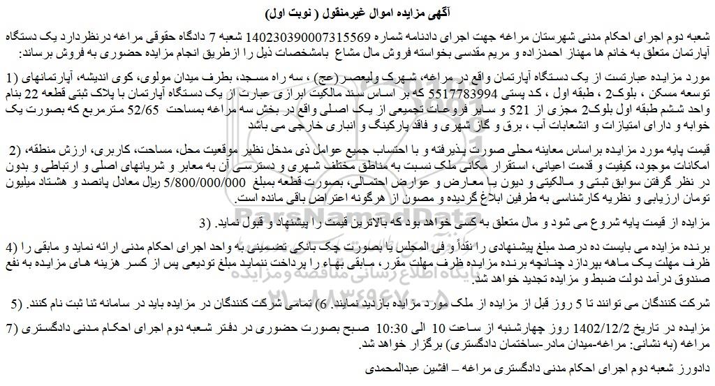 شعبه دوم اجرای احکام مدنی شهرستان مراغه جهت اجرای دادنامه شماره 140230390007315569 شعبه 7 دادگاه حقوقی مراغه درنظردارد یک دستگاه آپارتمان متعلق به خانم ها مهناز احمدزاده و مریم مقدسی بخواسته فروش مال مشاع بامشخصات ذیل را ازطریق انجام مزایده حضوری به فروش برساند: