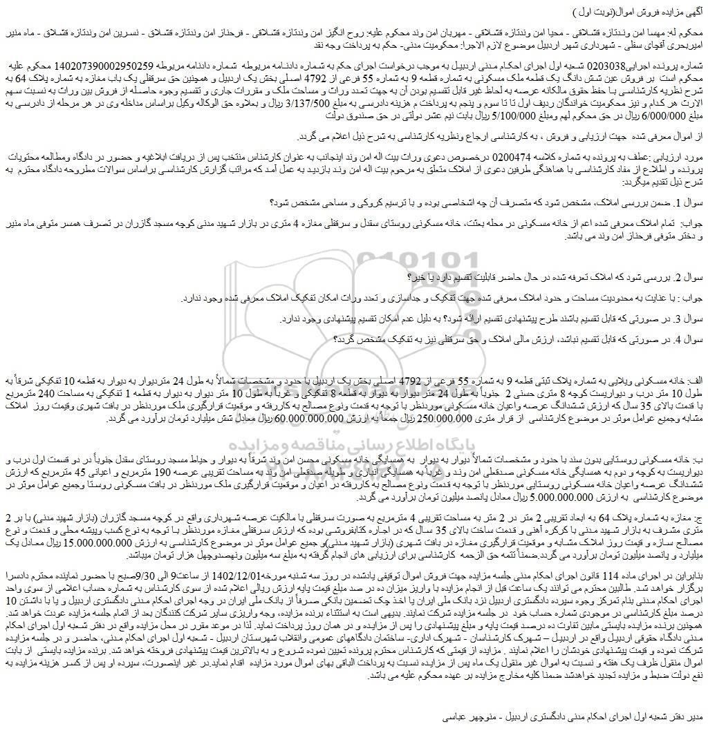 شماره پرونده اجرایی0203038 شعبه اول اجرای احکام مدنی اردبیل به موجب درخواست اجرای حکم به شماره دادنامه مربوطه شماره دادنامه مربوطه 140207390002950259 محکوم علیه محکوم است بر فروش عین شش دانگ یک قطعه ملک مسکونی به شماره قطعه 9 به شماره 55 فرعی از 4792 اصلی بخش یک اردبیل و همچنین حق سرقفلی یک باب مغازه به شماره پلاک 64 به شرح نظریه کارشناسی با حفظ حقوق مالکانه عرصه به لحاظ غیر قابل تقسیم بودن آن به جهت تعدد وراث و مساحت ملک و مقررات جاری و تقسیم وجوه حاصله از فروش بین وراث به نسبت سهم الارث هر کدام و نیز محکومیت خواندگان ردیف اول تا تا سوم و پنجم به پرداخت م هزینه دادرسی به مبلغ 3/137/500 ریال و بعلاوه حق الوکاله وکیل براساس مداخله وی در هر مرحله از دادرسی به مبلغ 6/000/000 ریال در حق محکوم لهم ومبلغ 5/100/000 ریال بابت نیم عشر دولتی در حق صندوق دولت